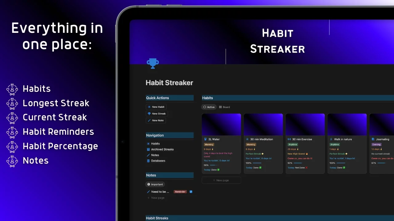 🔹 Habit Streaker Notion template where you can organize your habits, streaks, highest score and notes and store everything in one place