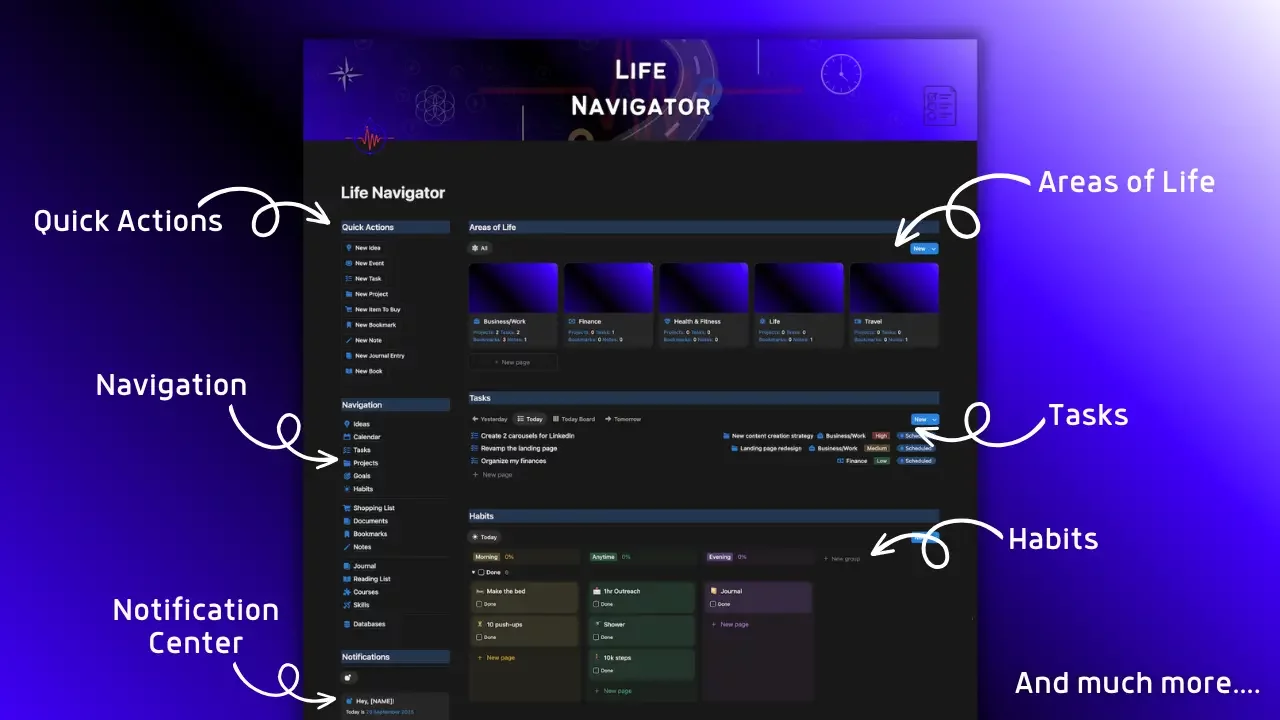 🔹 Areas of Life - group everything in an organized way, with built-in custom databases for projects, tasks, bookmarks, and notes for each area
