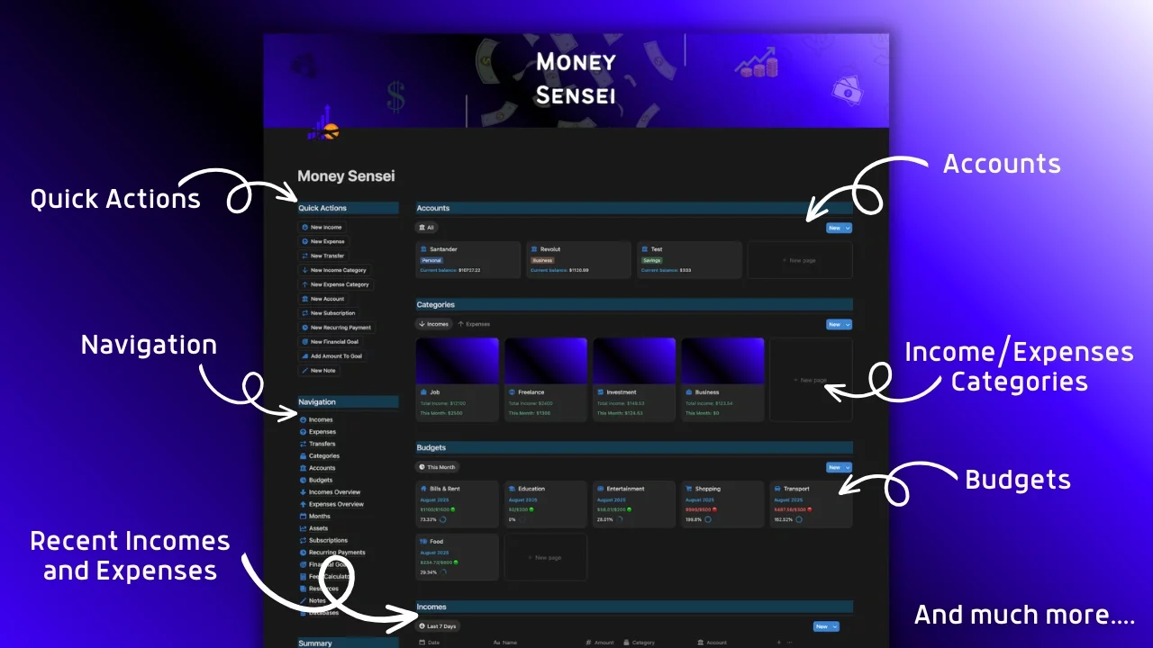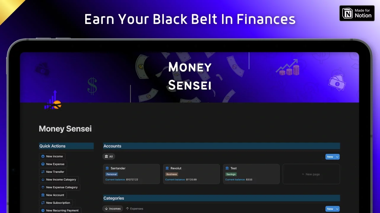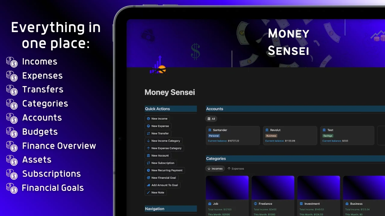 🔹 Money Sensei Notion template where you can organize and track your incomes, expenses, transfers, categories, accounts, budgets, overviews, monthly balance, assets, subscriptions, recurring payments, financial goals, resources and notes and store everything in one place