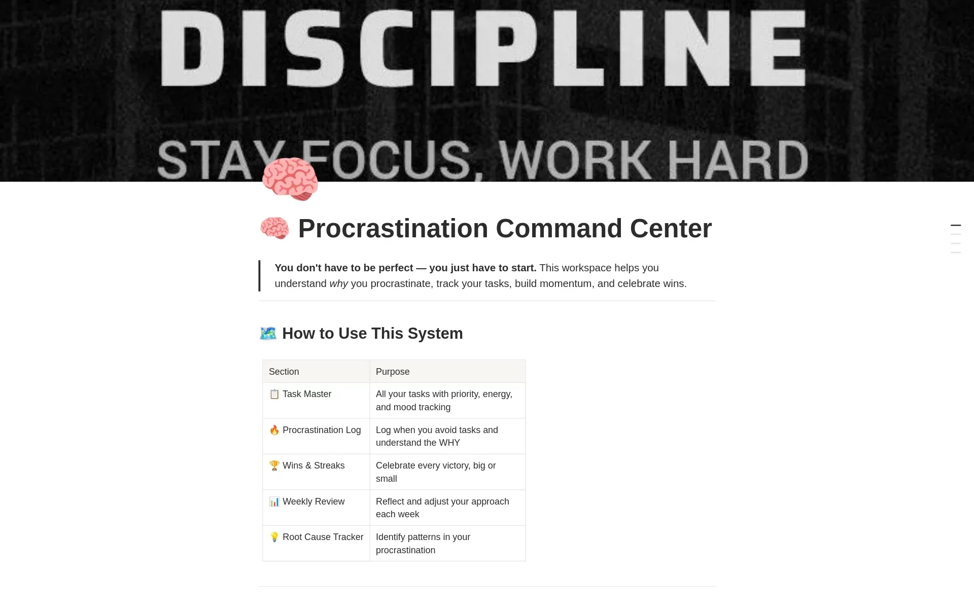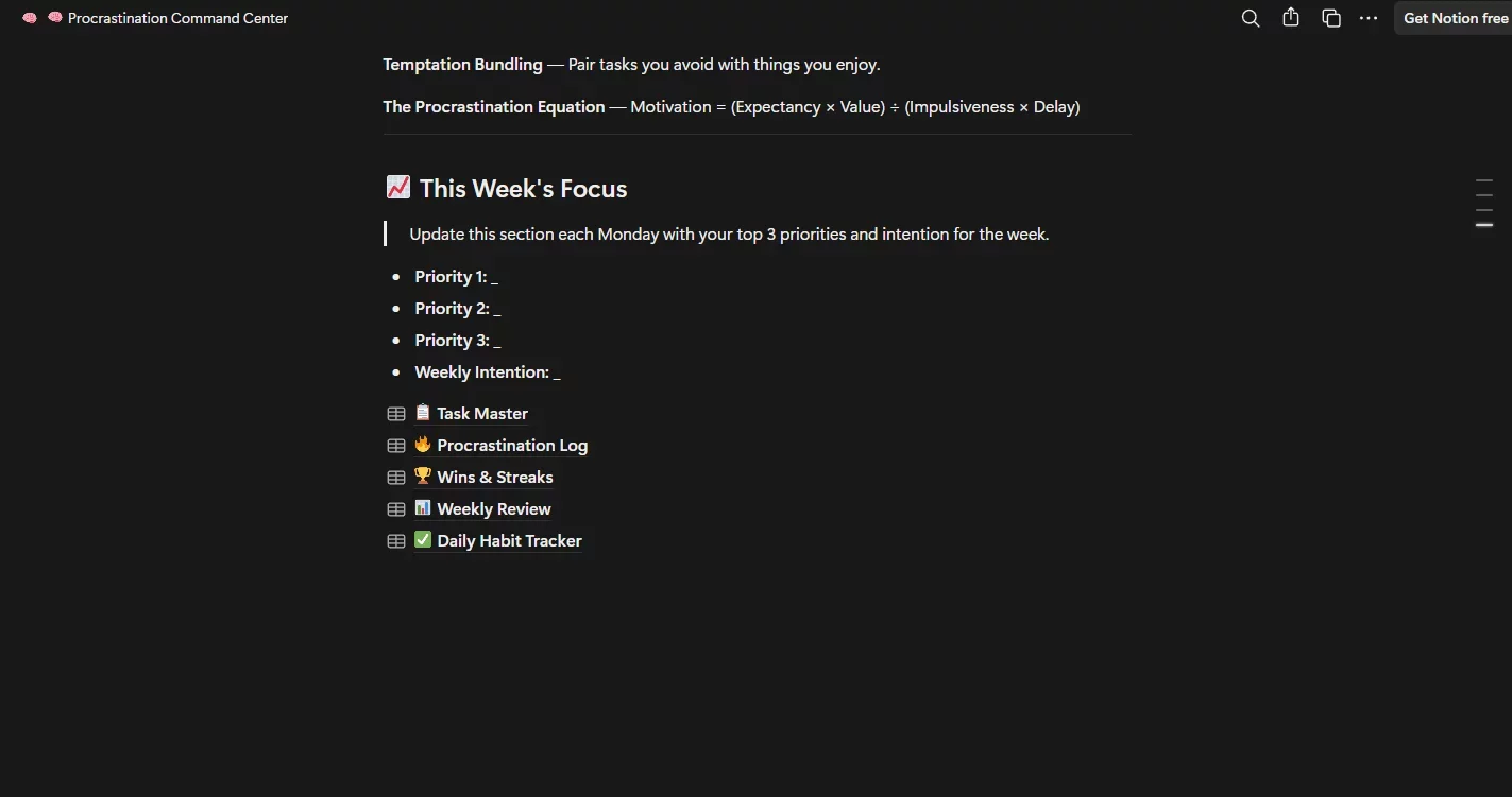 The Procrastination Command Center is a complete, all-in-one productivity system designed not just to track your tasks, but to help you deeply understand why you procrastinate, build momentum through small wins, and develop lasting habits β all inside a single Notion workspace.