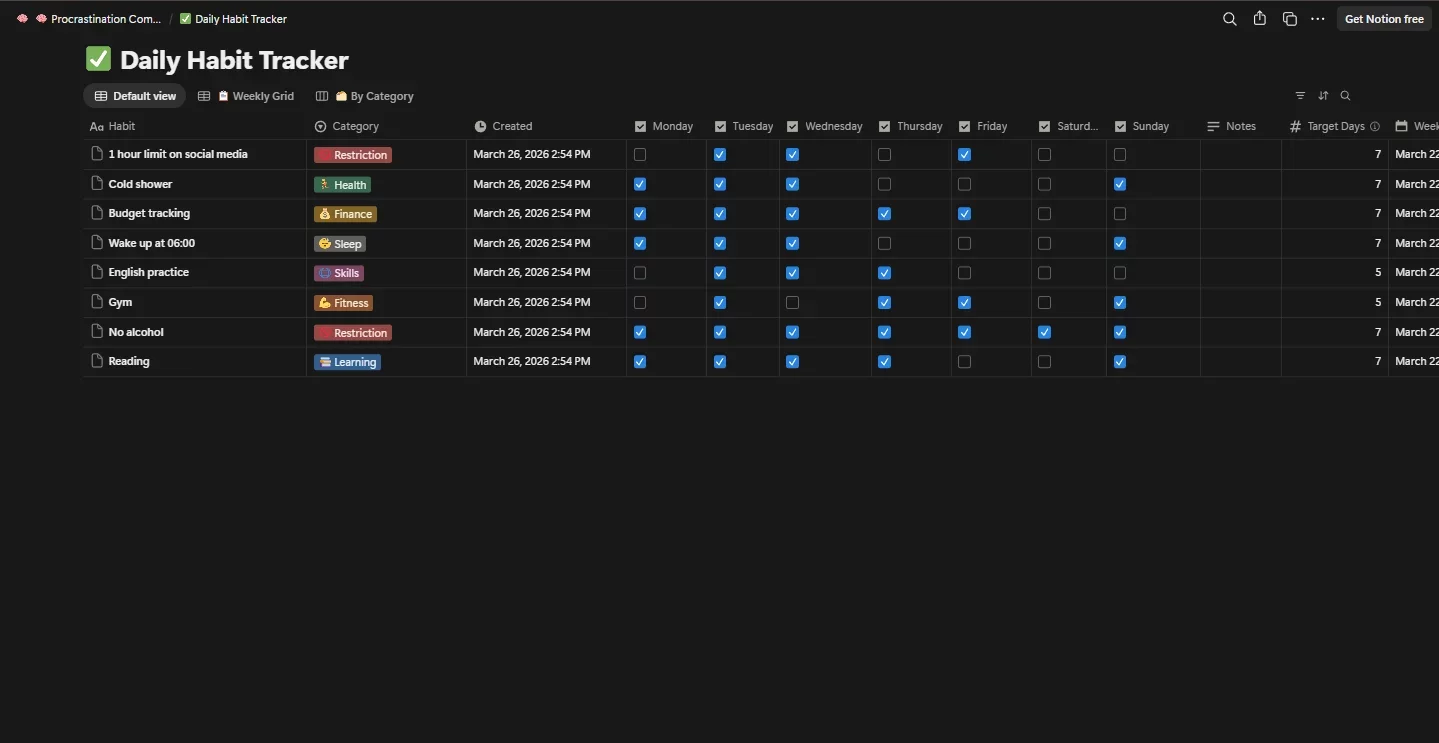 π₯ Procrastination Log β The most honest part of the system. Every time you avoid a task, log it here. Track the root cause (fear of failure, perfectionism, overwhelm, etc.), your avoidance behaviors, emotions felt, physical symptoms, how long you avoided it, and β most importantly β what finally got you started. Over time, patterns emerge and self-awareness grows.