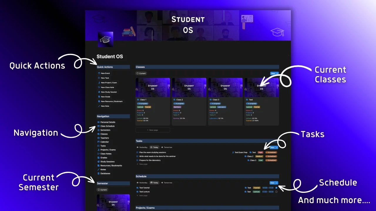 🔹 Student OS Notion template where you can organize and track your personal and university details, semesters, classes, attendance, teachers, calendar, tasks, projects / exams, class notes, grades, study sessions, resources and notes and store everything in one place