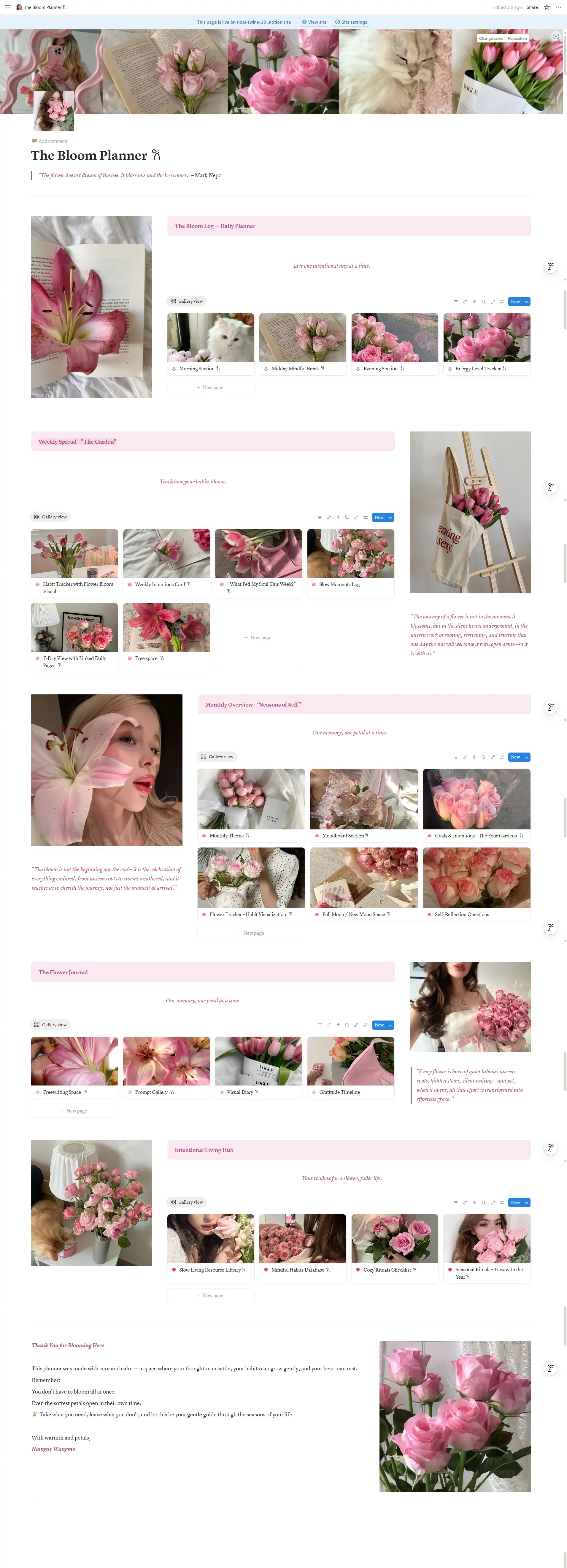 The Bloom Planner combines productivity and mindfulness, giving you the tools to plan effectively, reflect on your progress, and cultivate intentional living. Simply duplicate the template in Notion and start planning your best life today.