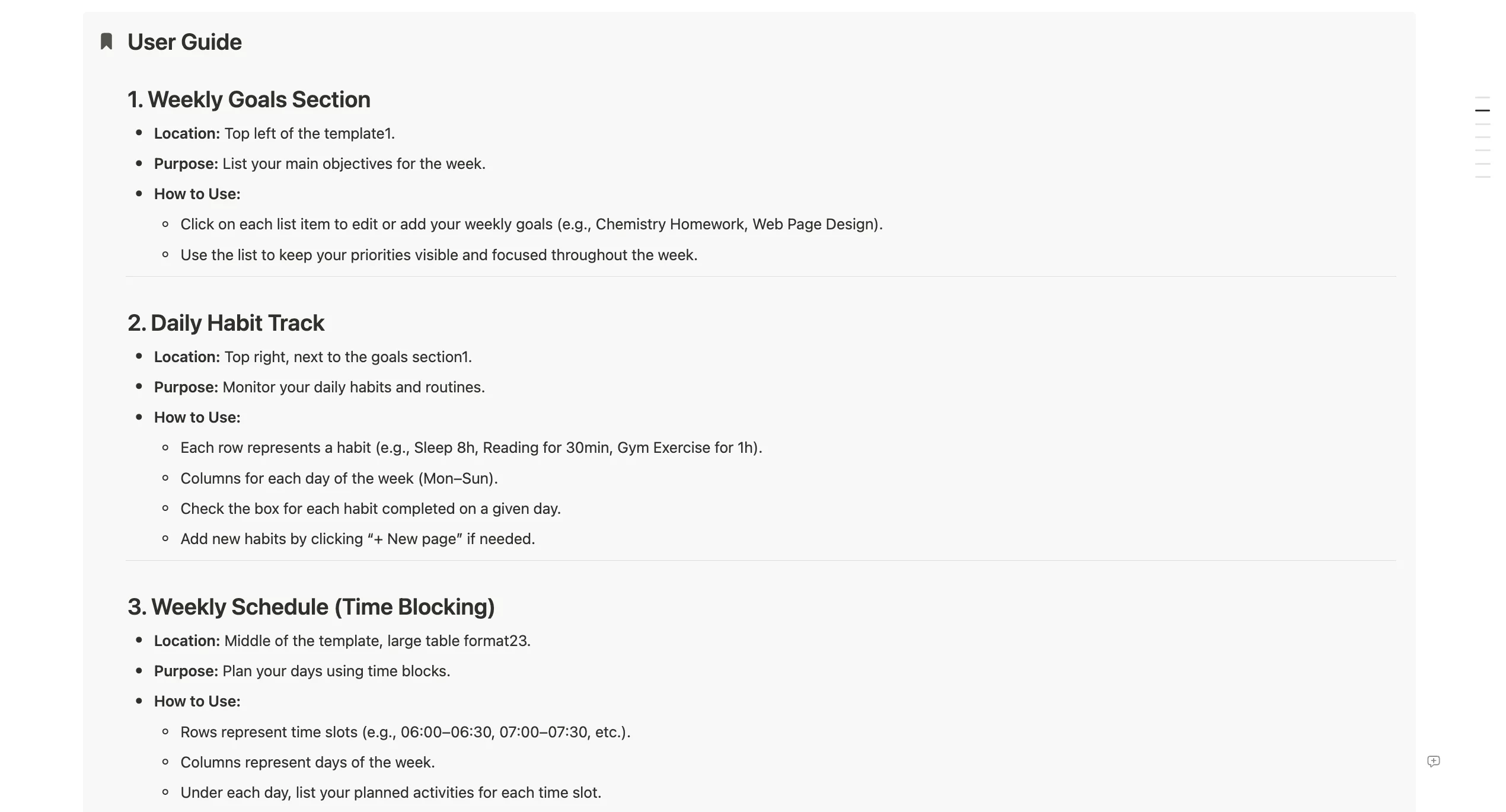 The Notion Weekly Tracker template is your all-in-one productivity hub for managing your week. Start by setting clear weekly goals to keep your priorities in focus1. Track your daily habits—like sleep, reading, and exercise—with an easy-to-use checklist for each day of the week. Use the detailed time-blocking table to plan your days by the half-hour, ensuring every task and commitment fits into your schedule. As you progress, log tasks that are in progress or completed for a clear overview of your accomplishments. At the end of the week, reflect on your habits and routines using the KISS framework (Keep, Improve, Start, Stop) to continuously improve your workflow and well-being. This template is designed for clarity, flexibility, and actionable insights, making it ideal for students, professionals, or anyone looking to optimize their weekly routine.